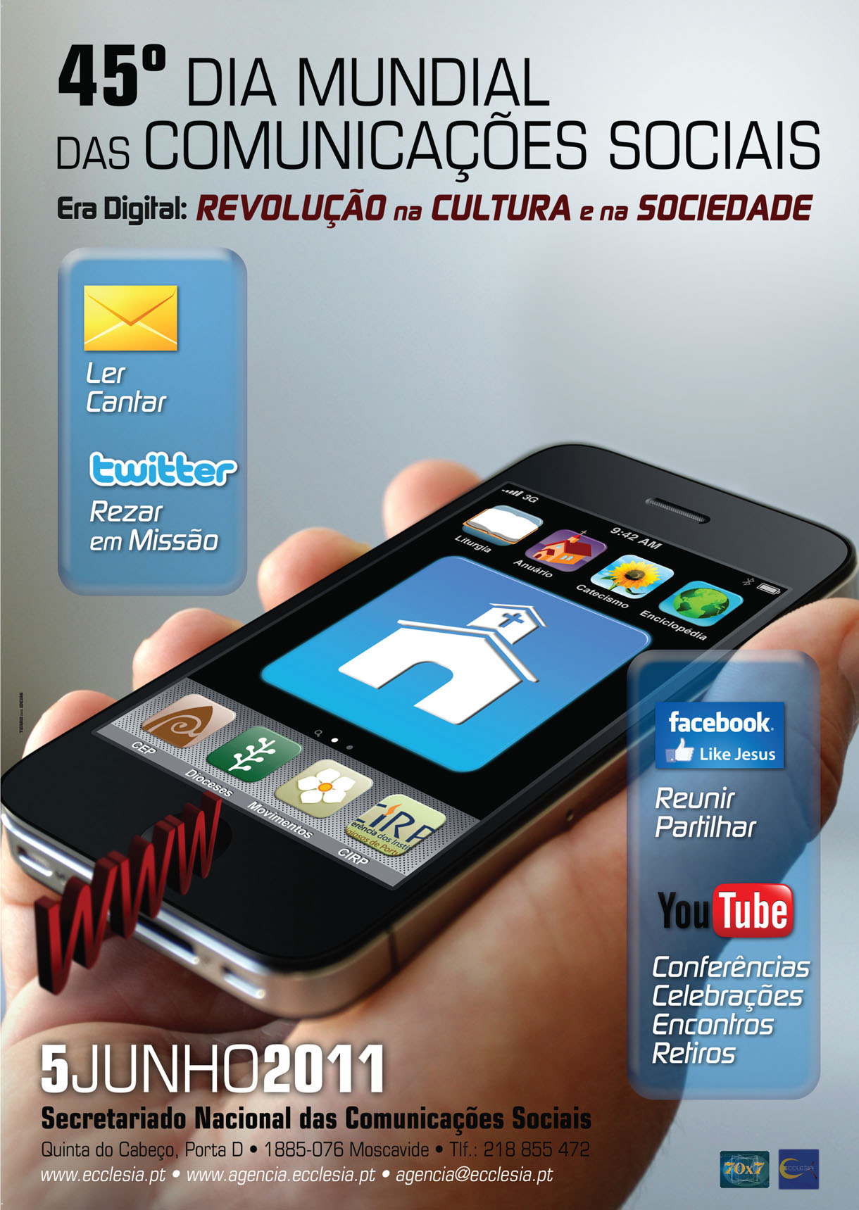 Aparecem em perspectiva metas até há pouco tempo impensáveis, que nos deixam maravilhados com as possibilidades oferecidas pelos novos meios e, ao mesmo tempo, impõem de modo cada vez mais premente uma reflexão séria acerca do sentido da comunicação na era digital. Isto é particularmente evidente quando nos confrontamos com as extraordinárias potencialidades da rede internet e a complexidade das suas aplicações. Como qualquer outro fruto do engenho humano, as novas tecnologias da comunicação pedem para ser postas ao serviço do bem integral da pessoa e da humanidade inteira. Usadas sabiamente, podem contribuir para satisfazer o desejo de sentido, verdade e unidade que permanece a aspiração mais profunda do ser humano.MMedia2011_cartaz