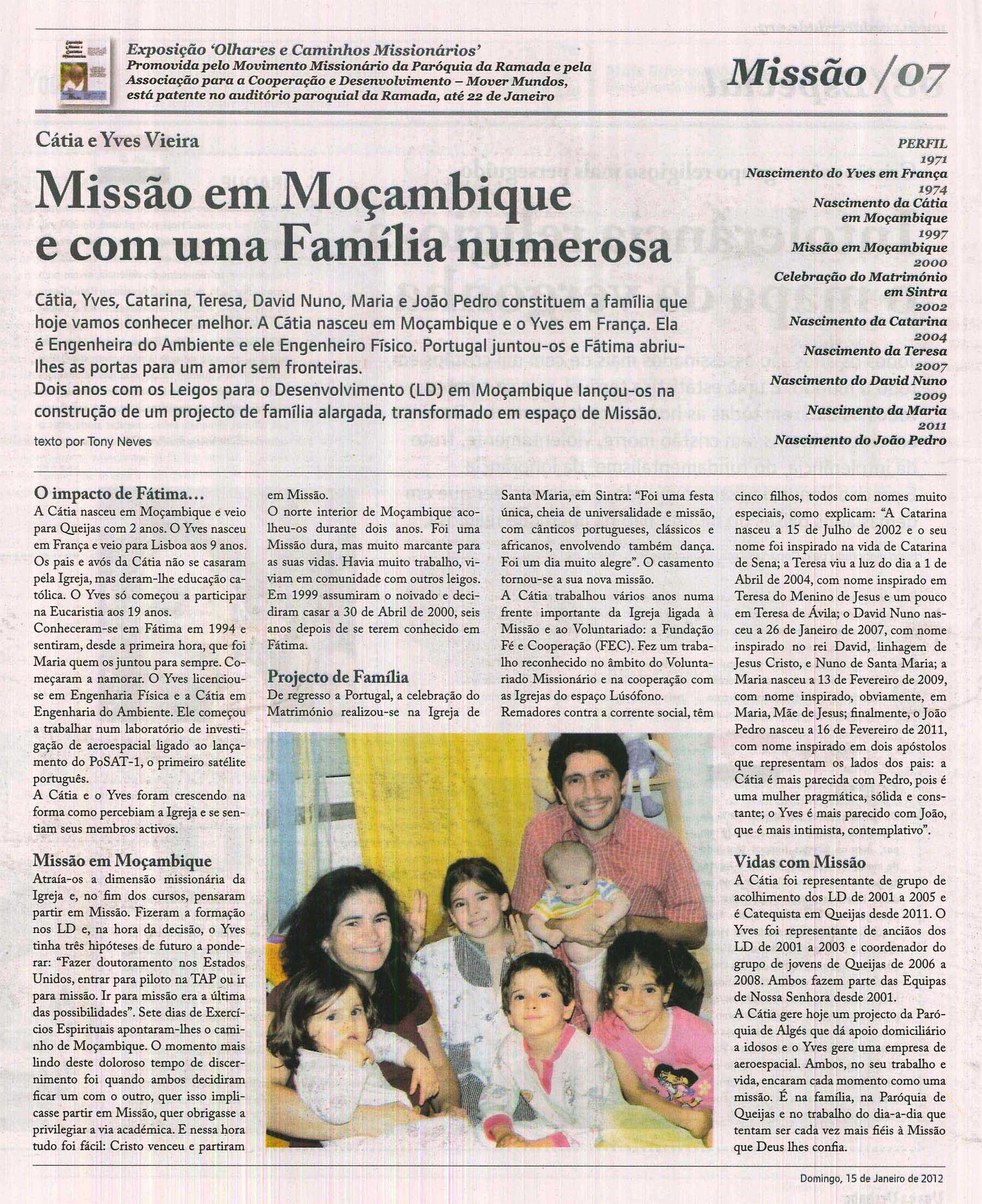 A Cátia nasceu em Moçambique e o Yves em França. Ela é Engenheira do Ambiente e ele Engenheiro Físico. Portugal juntou-os e Fátima abriu-lhes as portas para um amor sem fronteiras. Dois anos com os Leigos para o Desenvolvimento em Moçambique lançou-os na construção de um projecto de família alargada, transformado em espaço de Missão. Hoje, são pais de cinco filhos e ainda têm tempo para colaborarem na nossa Paróquia. Aqui fica o testemunho deste casal ao jornal Voz da Verdade. Bem hajam!