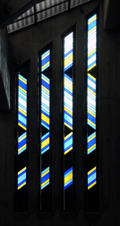 que por serem tão estreitas não me permitiram desenvolver um tema com maior densidade religiosa, limitando-me assim a organizar geometricamente estes vãos com base em barras diagonais, inclinadas a 45º, em contraste com a verticalidade dos elementos estruturais, em betão. Neste vitral usei vidro negro para marcar fortemente certos triângulos e, ainda, para acentuar as superfícies claras na parte superior, conferindo-lhe assim um sentido ascensional de ascese na procura da Luz em cima.