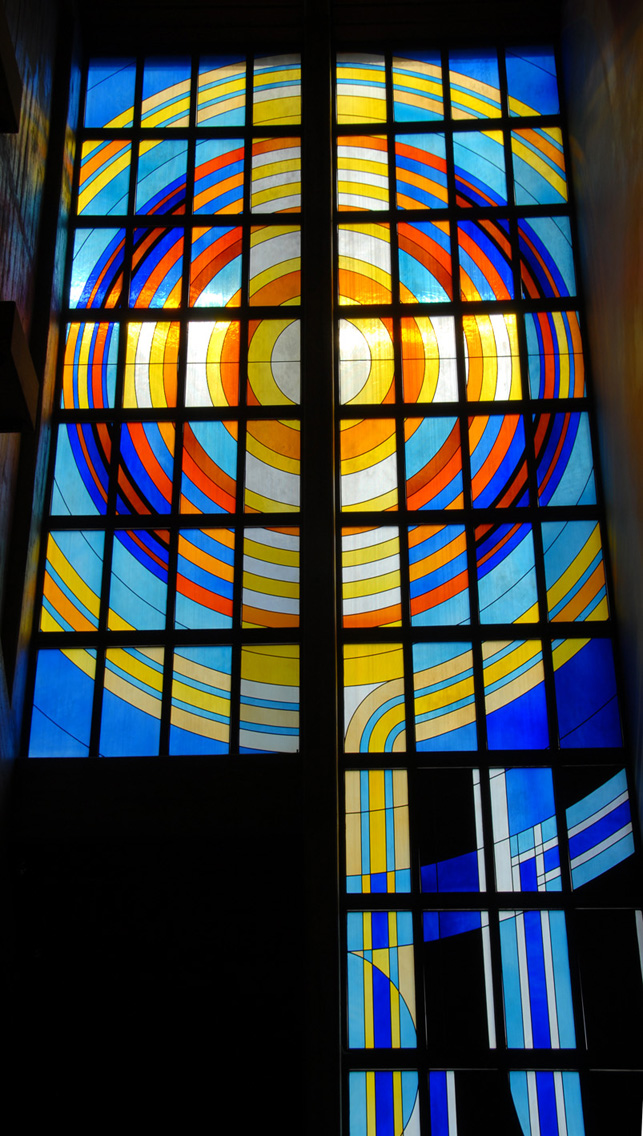 De todos, o vitral mais elementar é aquele que contorna a grande cruz aberta na parede, atrás do altar. Aqui o seu papel é muito simplesmente de criar vibração cromática em tomo desta cruz, que foi reforçada pelos arquitectos através de uma segunda cruz em ferro. […].