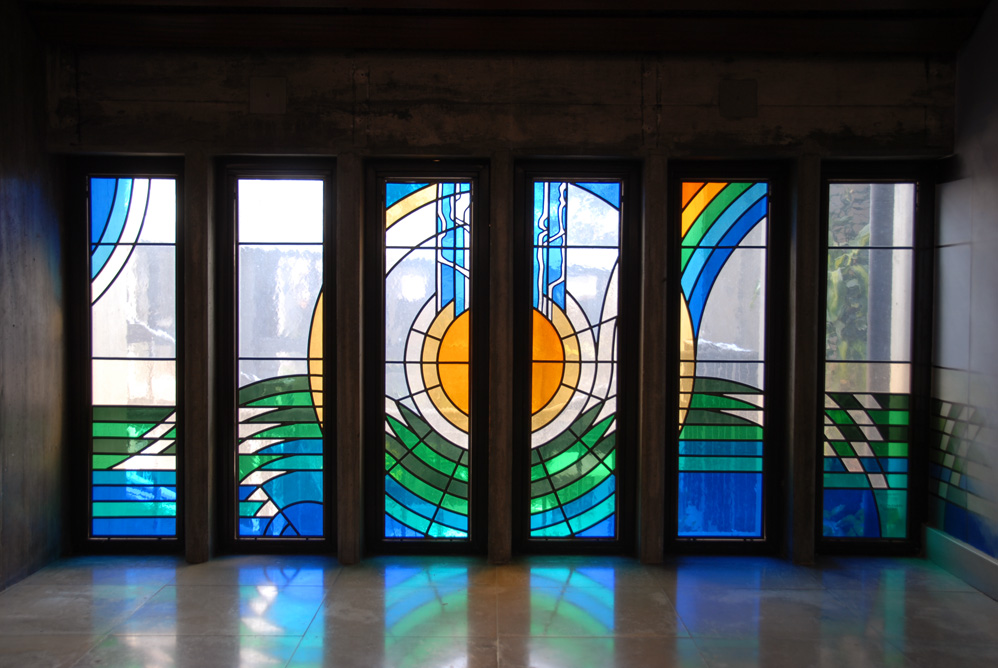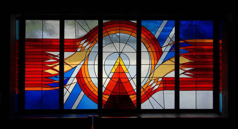 Finalmente, o vitral na entrada da igreja. […] Os dois temas simbólicos principais: o Fogo (a Fé) e o círculo como sua expansão, ou ainda como expansão da Consciência Divina.